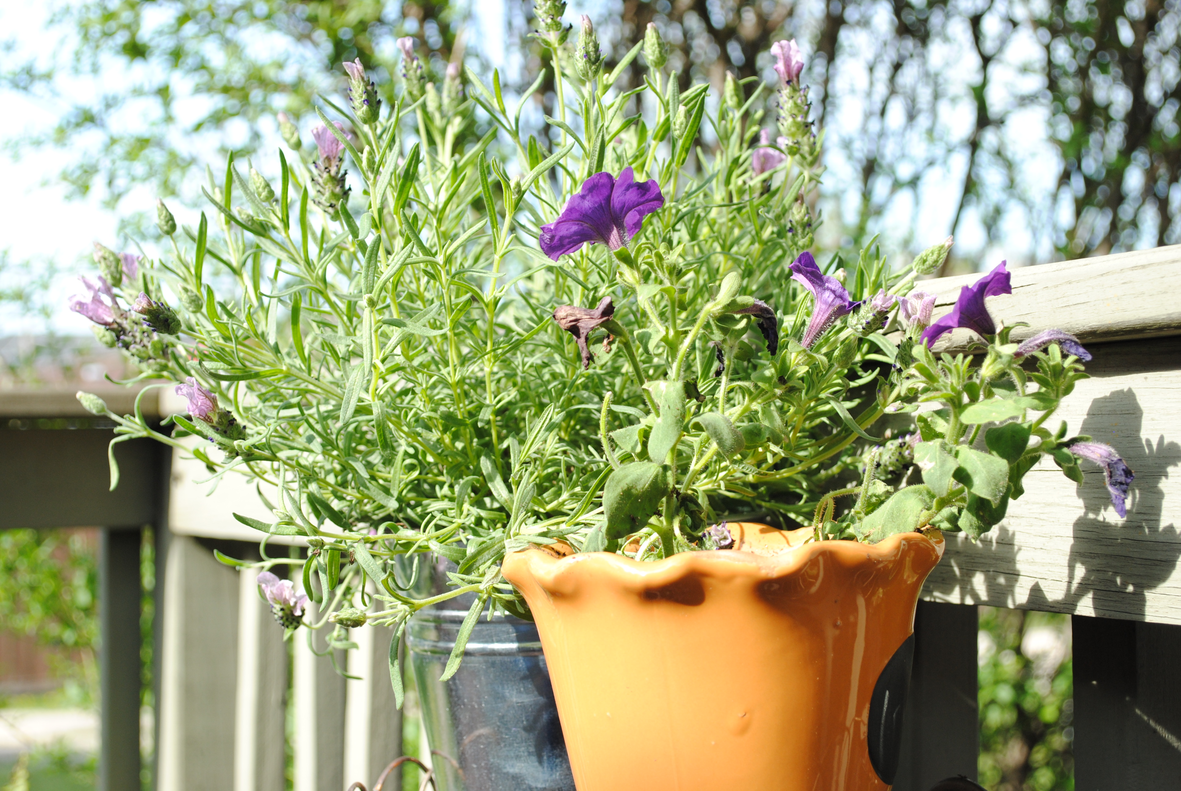 Hector and I dropped Evan at Grandma Debbie’s yesterday so we could do a few things outside without having to keep an eye on our little guy, he is FAST! We planted some planters and just enjoyed some time cleaning up some stuff together in our yard. I also realized I’ve gone a little crazy on the lavender (maybe it isn’t possible, I LOVE LAVENDER) but I have now about 5 different pots with some sort of lavender including this cute pot from Trader Joe’s that is already flowering: